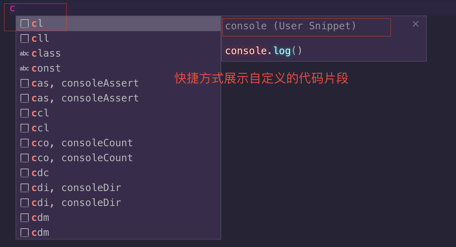 在vscode中你可以将常用的代码片段添加到 snippets中,这样你可以打几个字符就完整显示整块代码.